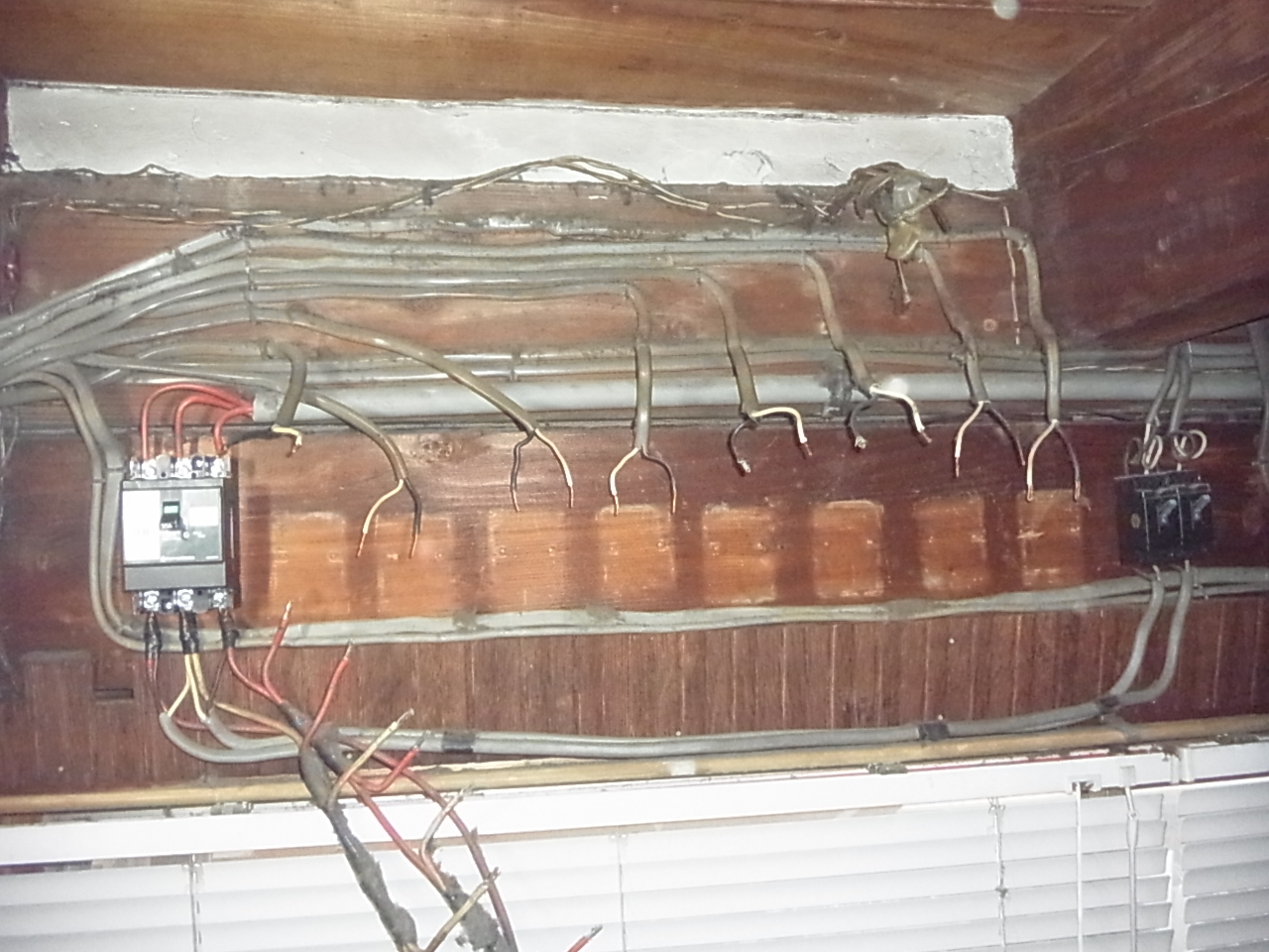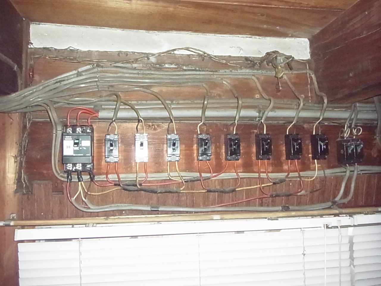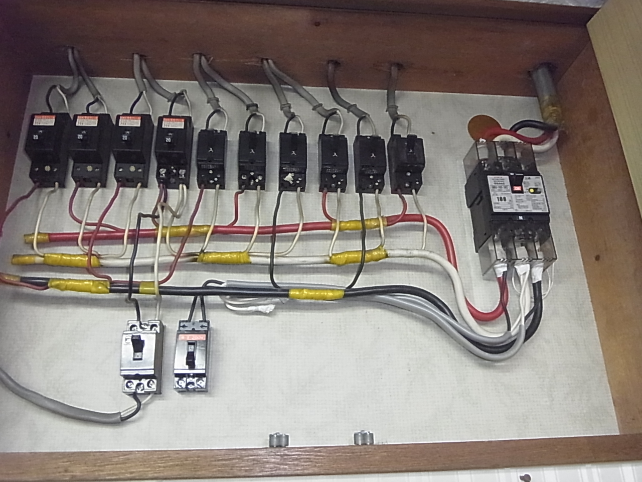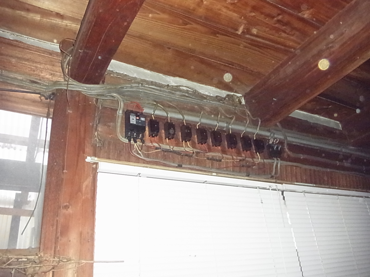 写真は、既設のブレーカーです。(配線と接続部分がむき出しの旧型ヒューズ式ブレーカー)