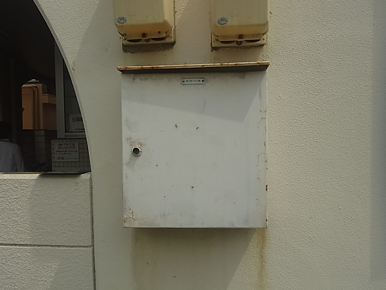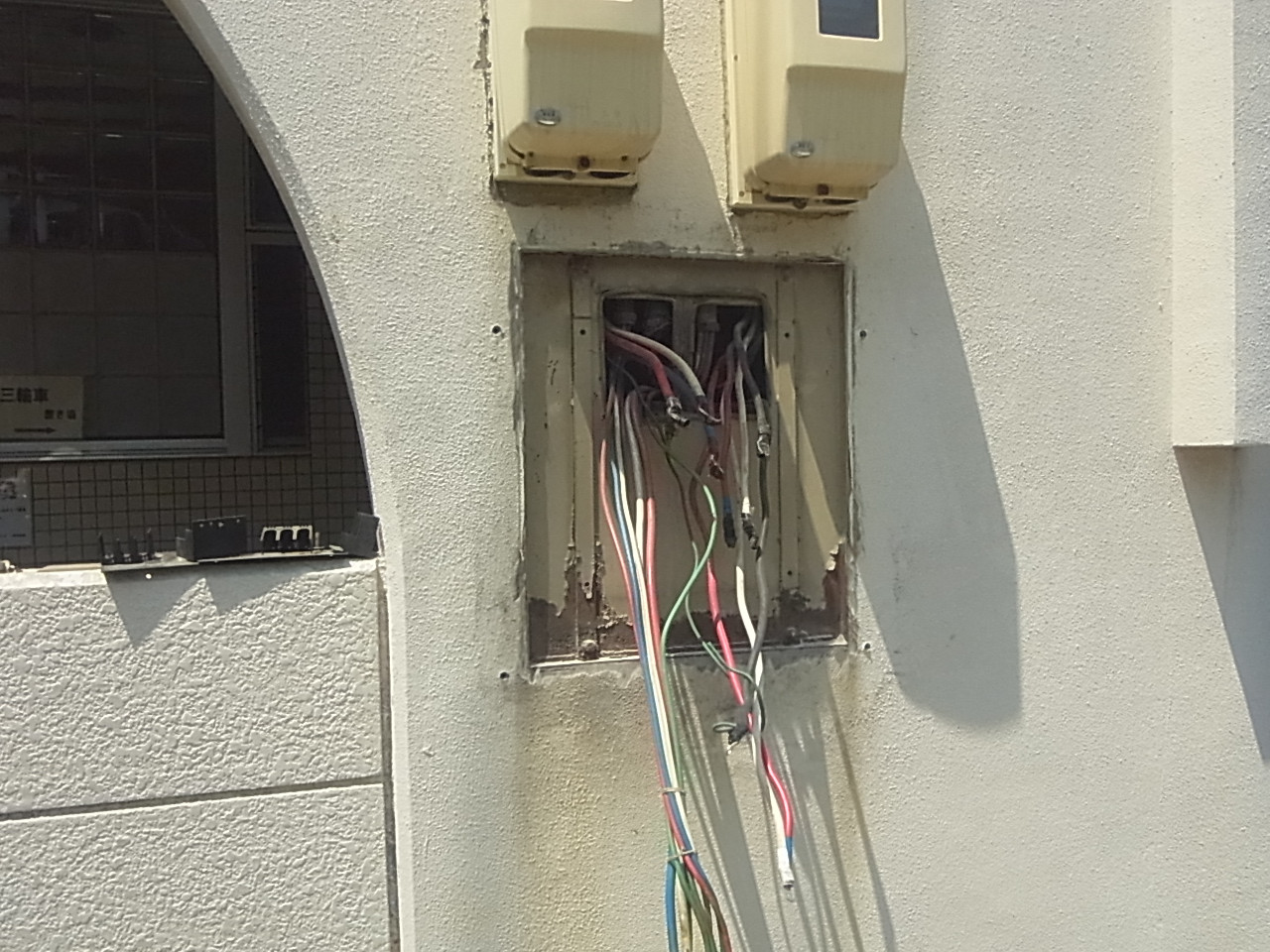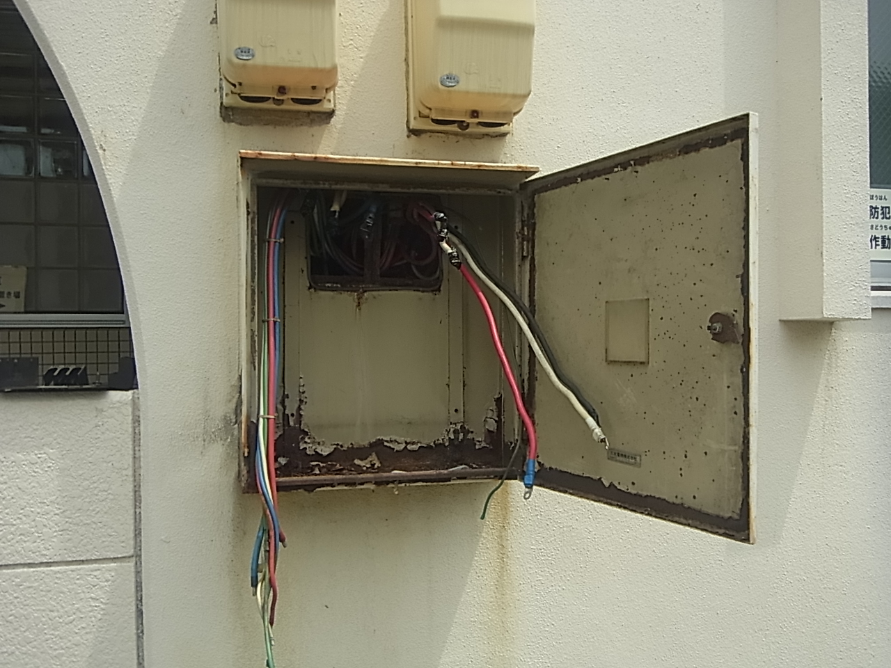 雨水などの侵入や、経年劣化により、錆びつき漏電等の支障が出ないように配電盤の鉄箱を取り換えます。既設は壁埋込でしたので建物外壁表面で切り落としました。