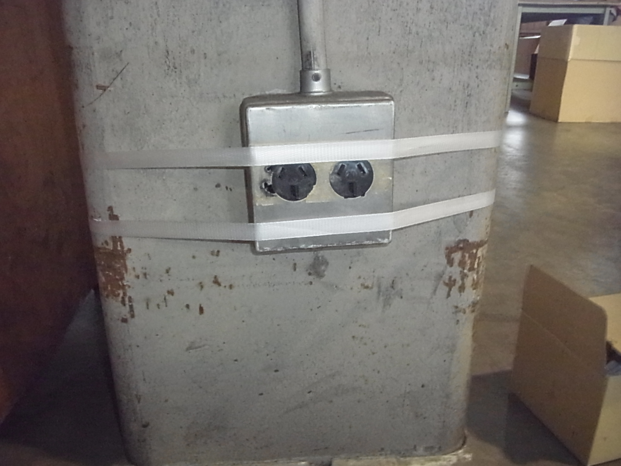 建物外部を配管し、倉庫内にてフォークリフト充電用のコンセントを設置しました。