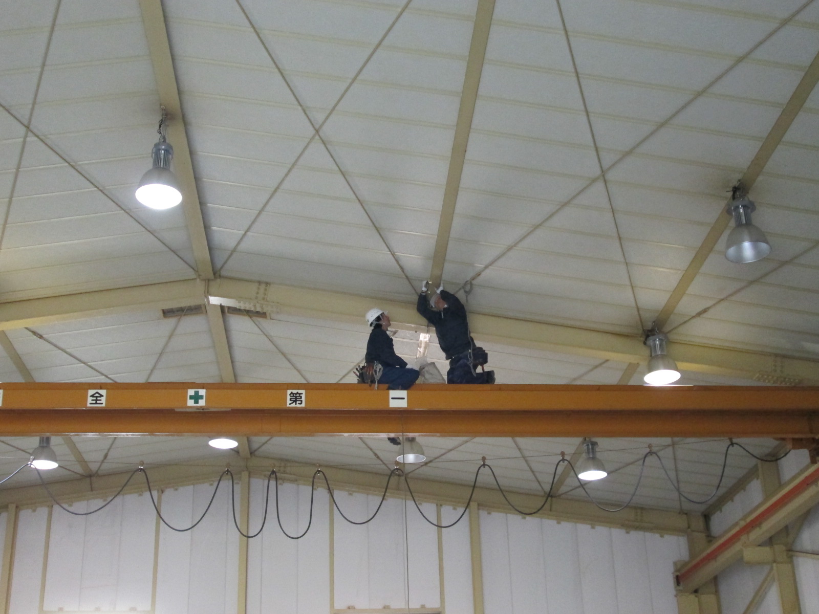 LED照明に取替中です。下で取付け加工をし、お客様設備のクレーンを使用させていただき取り付けをします。