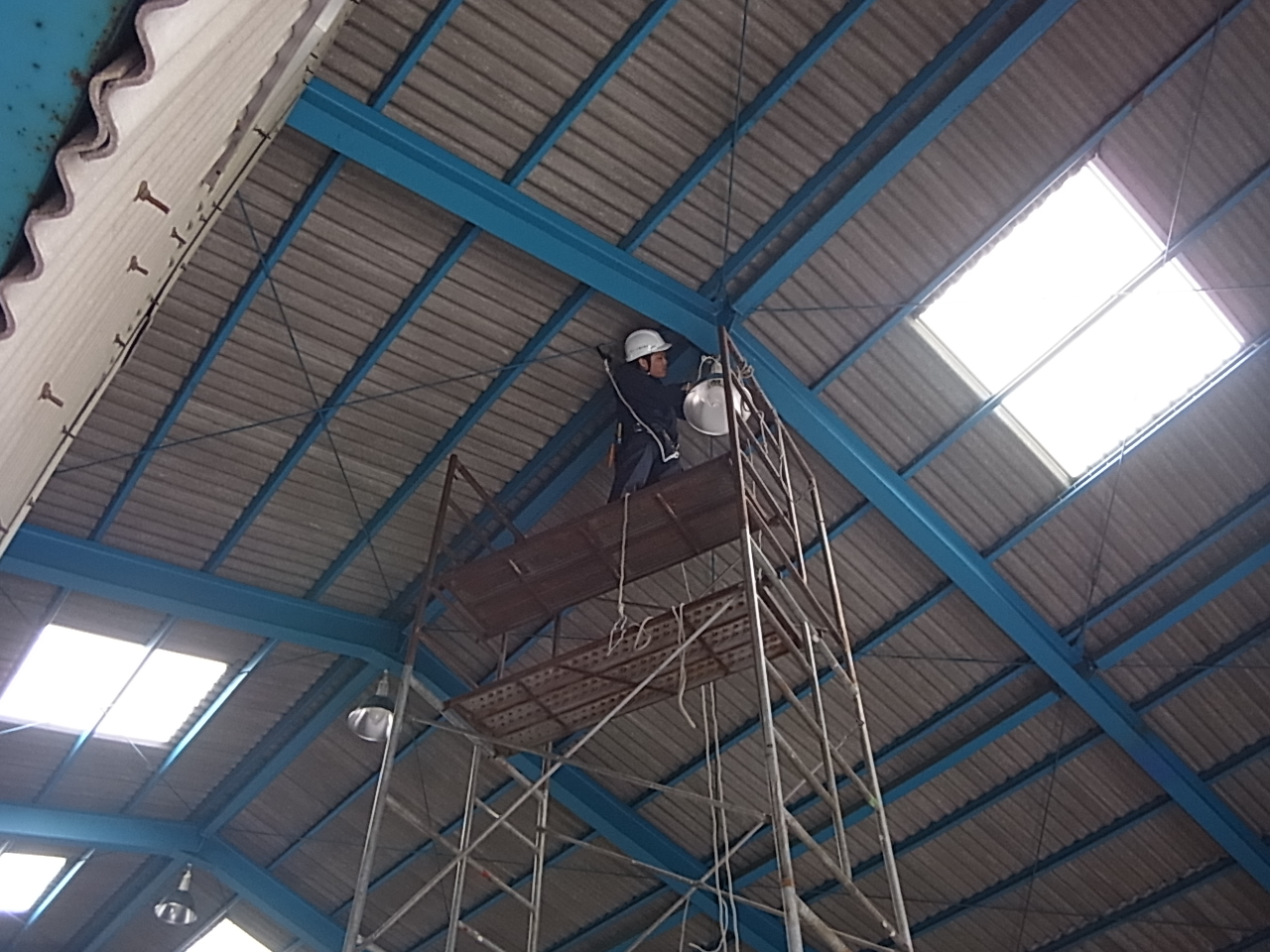 施工中です。広い工場でしたので高所作業車を2台とローリングタワーを1基を使っての施工になります。そして狭い場所では、長梯子を使用し工事を行いました。
